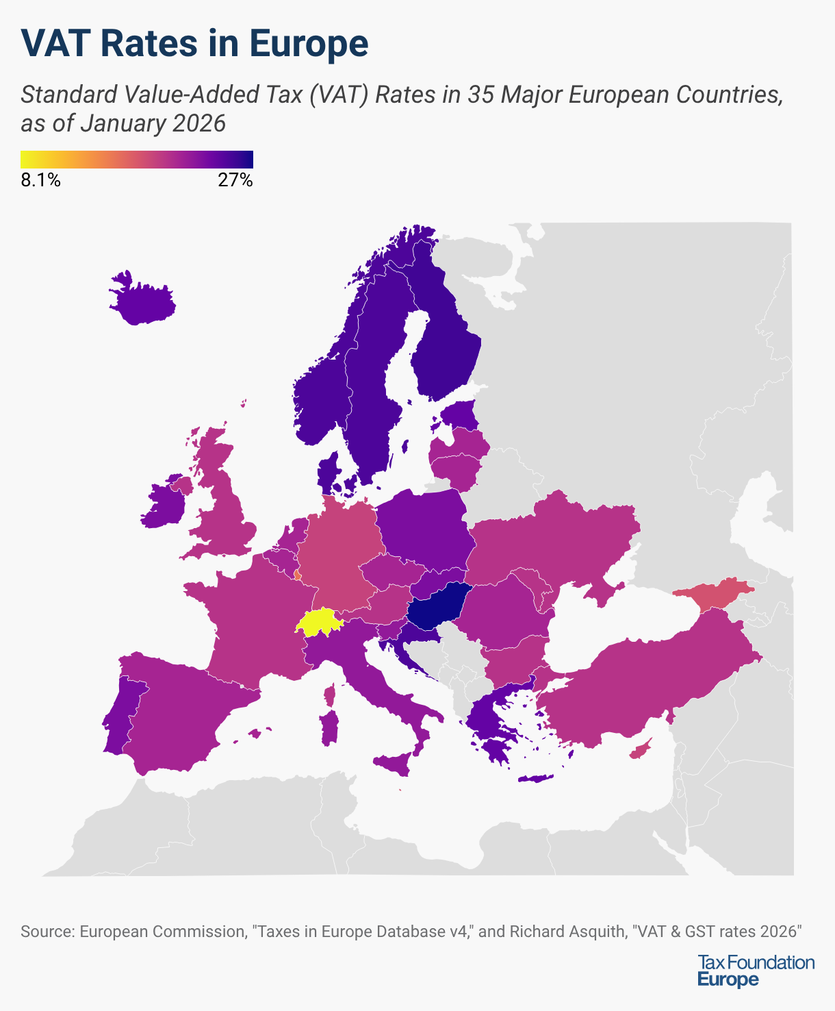 Many European nations have made adjustments to their VAT charges since final yr. Austria zero-rated some hygiene merchandise from 2026. Estonia has elevated its customary price from 22 to 24 p.c in July 2025. Germany is eroding its VAT base by transferring meals in eating places from the 19 p.c customary price to the 7 p.c lowered price from 2026. Greece prolonged the 30 p.c discount in all VAT charges to extra islands. Lithuania broadened its VAT base by transferring some reduced-rate gadgets from the 9 to the 12 p.c bracket, a reversal of earlier coverage adjustments in 2023. The Netherlands moved lodging providers from the 9 p.c lowered price to the 21 p.c customary price. Finland has additional lowered its lowered price from 14 to 13.5 p.c, widening the hole to its 25.5 p.c customary price. Romania has elevated its customary price from 19 to 21 p.c in August 2025 and consolidated its 5 and 9 p.c brackets right into a single 11 p.c lowered price.