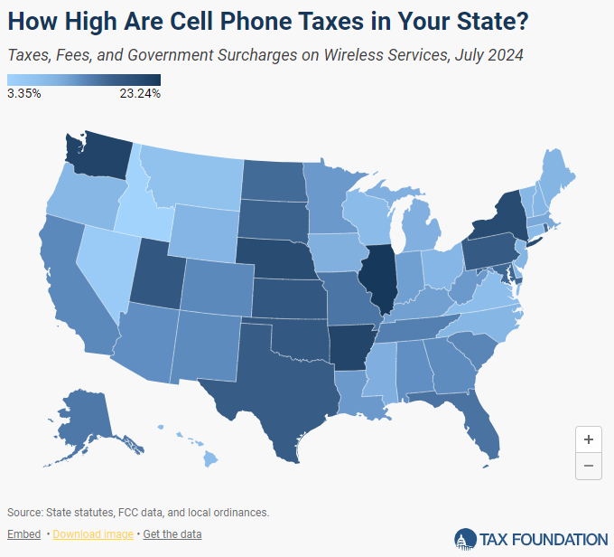 Taxes and charges on the everyday American wi-fi shopper elevated considerably this 12 months from 24.5 p.c of a typical month-to-month invoice in 2023 to 26.8 p.c in 2024. This complete consists of state and native taxes averaging 14.0 p.c and the Federal Common Service Fund (FUSF) fee of 12.8 p.c.[1]