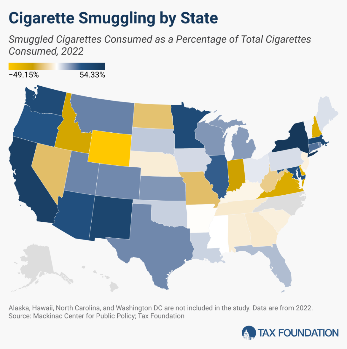 charges on cigarettes induce substantial black and grey market motion of tobacco merchandise into high-tax states from low-tax states or international sources. - New York has the very best inbound smuggling exercise, with an estimated 54.3 p.c of cigarettes consumed within the state deriving from smuggled sources in 2022. New York is adopted by California (46.7 p.c), New Mexico (41.2 p.c), Massachusetts (39.7 p.c), and Washington (36.8 p.c).