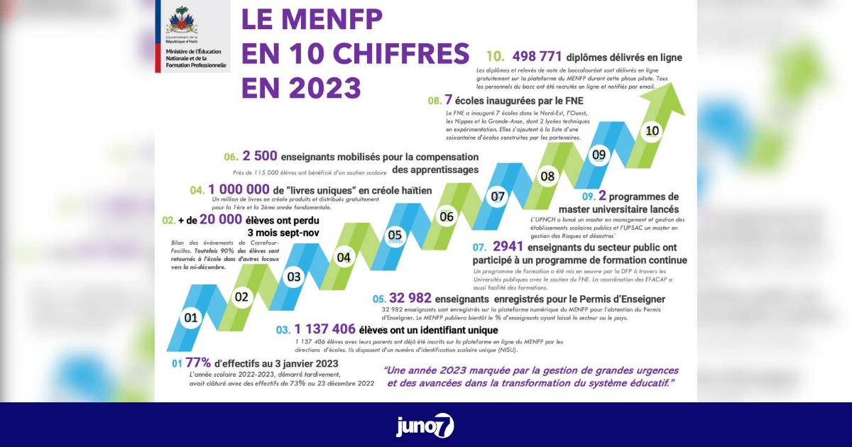 Parmi ses réalisations, le ministère de l’éducation nationale annonce que 1 137 406 élèves avec leurs dad and mom ont déjà été inscrits sur la plateforme en ligne du MENFP par les instructions d’écoles. Ils disposent d’un numéro d’identification scolaire distinctive (NISU). Un million de livres en créole produits et distribués gratuitement pour la 1ère et la 2ème année fondamentale. 32 982 enseignants sont enregistrés sur la plateforme numérique du MENFP pour l’obtention du Permis d’Enseigner. Le MENFP publiera bientôt sur le pourcentage d’enseignants ayant laissé le secteur ou le pays.