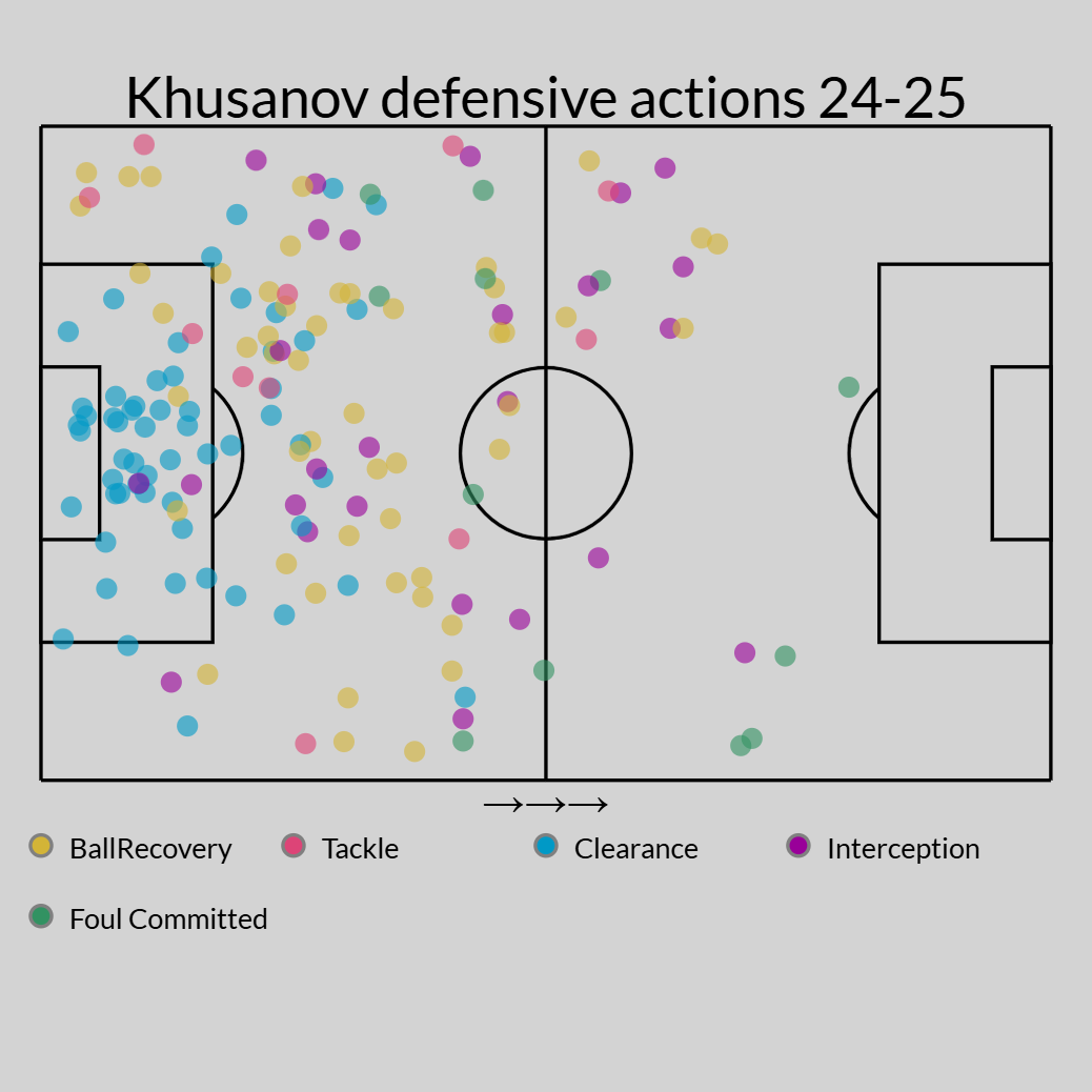Khusanov’s spectacular game-reading abilities and bodily fashion of defending ought to make him effectively geared up to take care of the depth of the Premier League, however there is a flip-side to his eagerness to compete and deal with (73% profitable per 90 minutes). It means he operates on small margins and his urge for food for a last-ditch interception could cause pointless fouls.