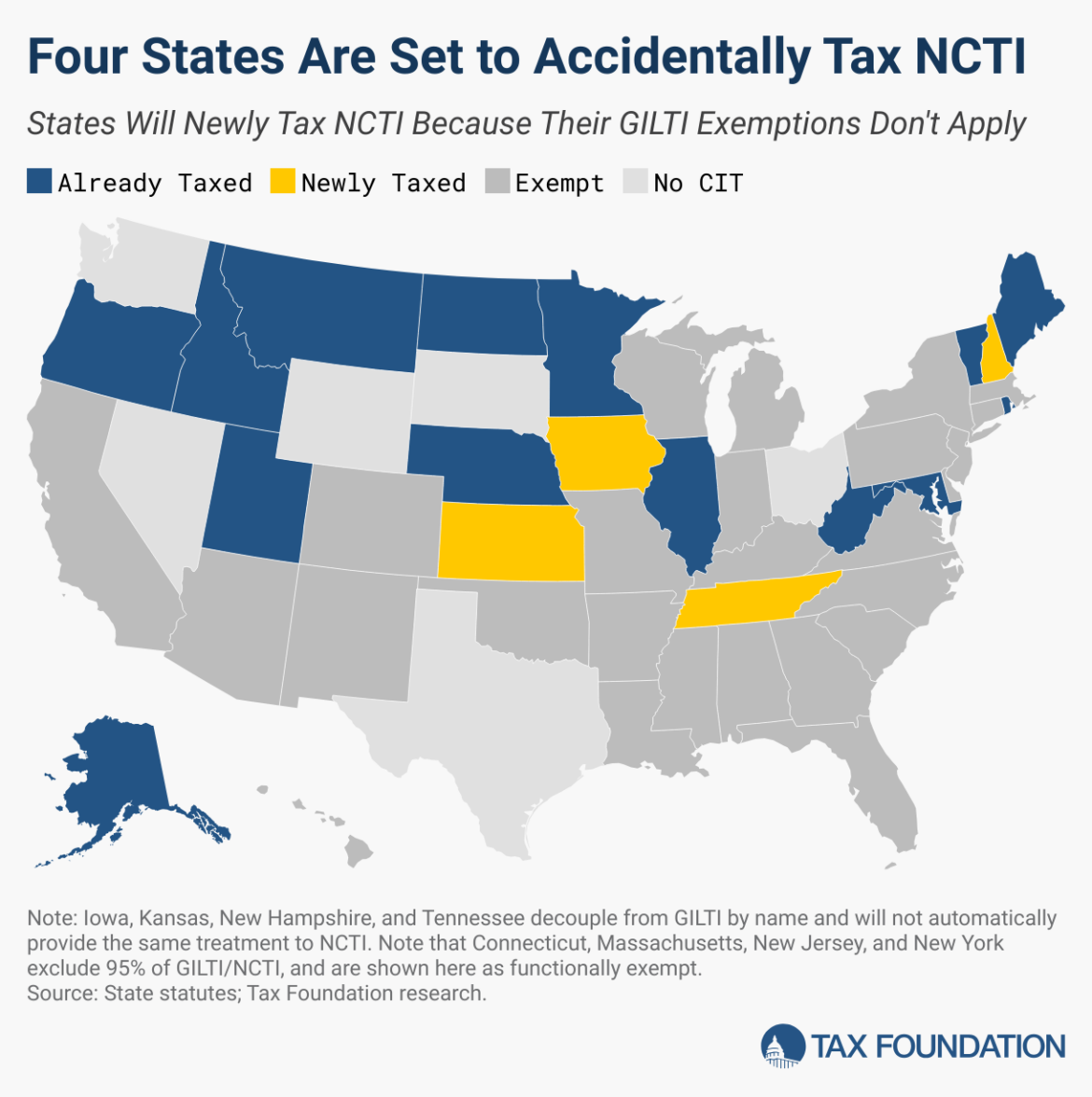 Based mostly on our statutory evaluation, the chance in Iowa, Kansas, New Hampshire, and Tennessee is easy. States by which GILTI was excluded by means of a willpower that it constituted deductible dividend or Subpart F earnings ought to afford the identical therapy to NCTI, however since there is no such thing as a assure that tax directors received’t revisit the query, it’s price a fast technical apart to know why the exclusion is acceptable.